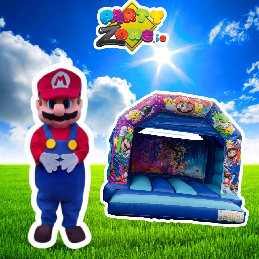 Mario mascot hire Dublin | Super Mario bouncy castle hire Dublin | Mario 12x12 bouncy castle | Mario party package Dublin | gaming bouncy castle hire Dublin | kids gaming party Dublin | bouncy castle and mascot bundle | Mario themed party hire | mascot costume hire Dublin | partyzone.ie bouncy castle hire