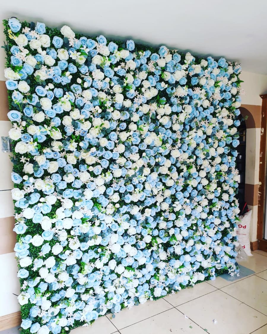 Our unique Blue Flower wall come in a range of colours and stand 8ftx8ft.(this size can be smaller if needs be smallest 6x6)