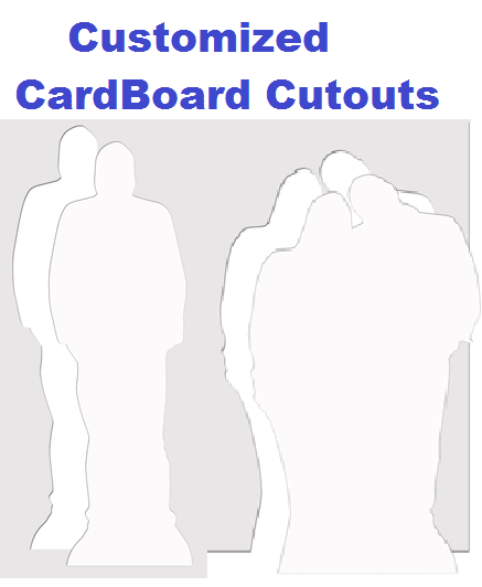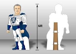 Available in 3 basic sizes: Lifesize - up to 6ft (183cms) high, Midi - up to 4ft (120cms) high, and Mini up to 2.5ft (75cms) high. They are all custom made from your images, photos or graphics files and supplied with an easel on the back to allow free standing. Leave the easel folded down for hanging on a wall or door. The larger size standups are folded for easy shipping and storage - assembly in less than 2 minutes.