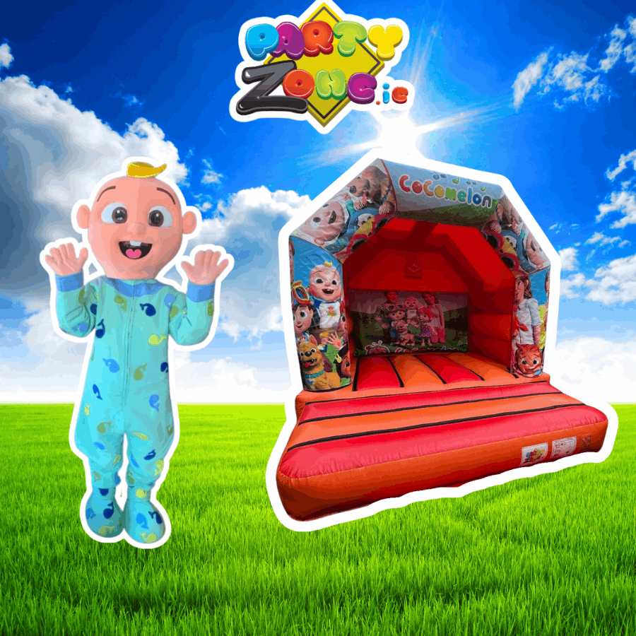 Cocomelon mascot hire Dublin | JJ mascot hire Dublin | Cocomelon bouncy castle hire Dublin | Cocomelon 12x12 bouncy castle | toddler party package Dublin | kids party hire Dublin | bouncy castle and mascot bundle | Cocomelon themed party Dublin | mascot costume hire Dublin | partyzone.ie bouncy castle hire