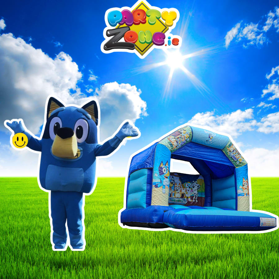 Bluey mascot hire Dublin | Bluey bouncy castle hire Dublin | Bluey 12x12 bouncy castle | Bluey party package Dublin | toddler party hire Dublin | kids party package Dublin | bouncy castle and mascot bundle | mascot costume hire Dublin | character party hire Dublin | partyzone.ie